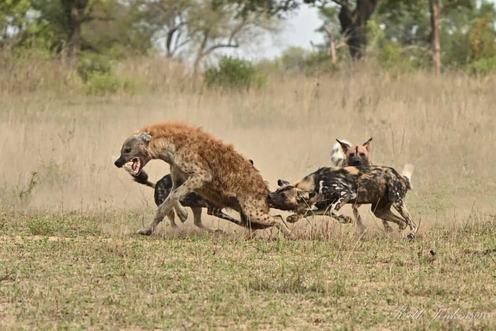 Wildlife Drama Unfolds: African Wild Dogs vs. Hyena in a Tense Battle for Survival at Inyati Game Lodge
